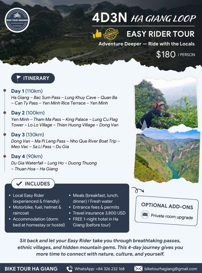 Embark on a life-changing adventure with the Ha Giang Loop Easy Rider —a 4-day, 3-night loop through northern Vietnam’s most breathtaking landscapes. From the winding roads of the Karst Plateau Geopark to cozy stays in traditional villages, this motorbike tour is the perfect balance of adrenaline and cultural immersion. You'll stay in charming towns like Yên Minh, Đồng Văn, and Du Già, with the final night spent at a luxurious homestay featuring a pool overlooking majestic mountains.