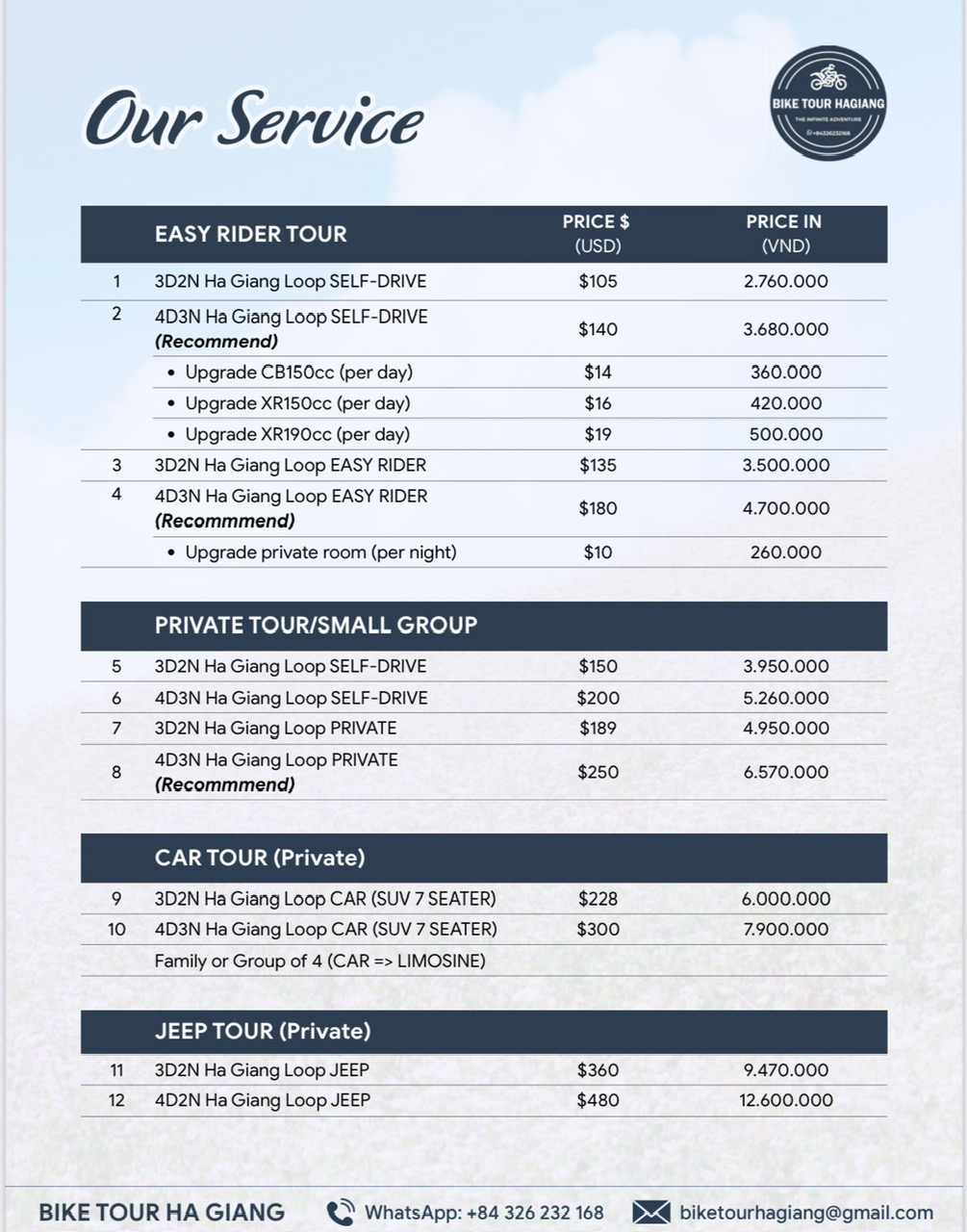 Here’s the updated Ha Giang Loop Tour Price List 2025 from Bike Tour Ha Giang, offering the best Ha Giang tour packages for every traveler: from self-drive adventures to private car or jeep tours.